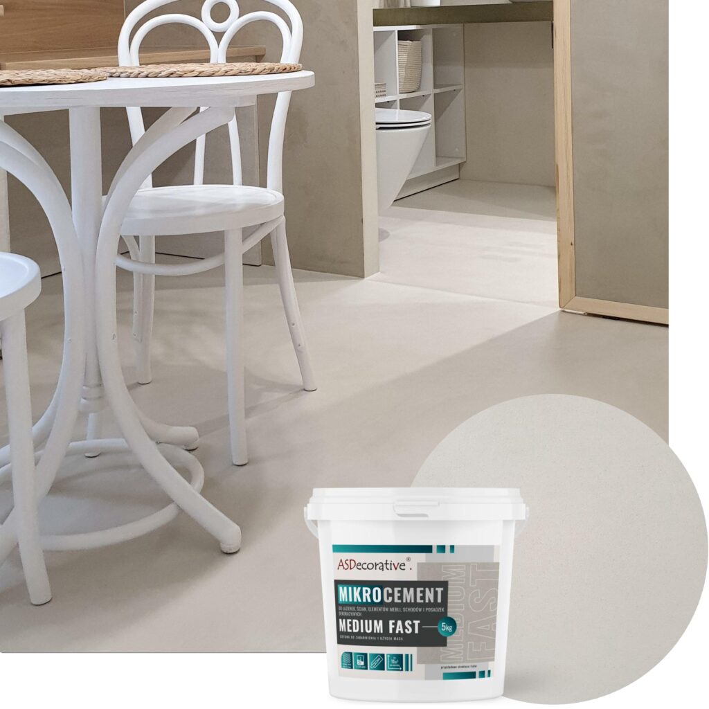 Mikrocement w postaci gotowej do użycia i zabarwienia masy, o średnim uziarnieniu, do łazienek, kuchni, podłóg, schodów, mebli i ścian (od 18,75 zł/1m2 – 1 warstwa)