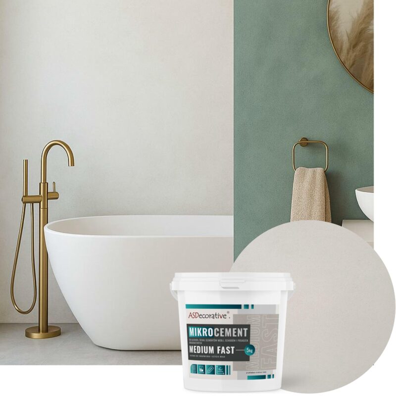 Mikrocement MEDIUM FAST to bardzo popularny gotowy do zabarwienia i użycia  mikrocement z średnim ziarnem kruszywa, o niezwykle szerokim zakresie zastosowania. Przeznaczony jest do wykonania dekoracyjnych warstw, prawie całkiem gładkich lub strukturalnych w zależności od preferencji i sposobu szlifowania, również w strefach mokrych w łazienkach. Pozwala na uzyskanie monokolorystycznych powierzchni z bardzo subtelnym cieniowaniem. Możliwe jest uzyskanie wyraźniejszego cieniowania tzw. efektu „smoke” poprzez natryskowe naniesienie zabarwionego IMPREGNATU lub lakieru SEALER AQUA, podczas wykonywania warstw zabezpieczających. Mikrocement MEDIUM FAST, zabarwiony dowolnym pigmentem z palety COLORANTE  pozwala na uzyskanie efektu betonu architektonicznego w jednym z wielu dostępnych kolorów szarości i grafitów. Z kolei użyty bez pigmentu w naturalnym kolorze OFF WHITE lub delikatnie zabarwiony jednym z wielu odcieni kaszmiru lub beżu, daje efekt np. glinianego tynku, idealnie pasuje do wnętrz utrzymanych w stylistyce japandi, wabi sabi lub boho. Dozowanie pigmentu COLORANTE w zakresie 0-75ml na 5kg MEDIUM FAST  (0-15ml/1kg) pozwala na uzyskanie nawet kilkudziesięciu modnych odcieni dla każdego dostępnego koloru.