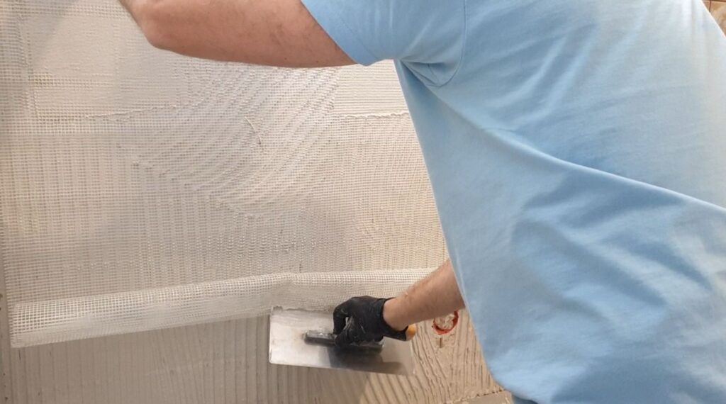 - Wklej siatkę zbrojącą i wygładź powierzchnię zbierając nadmiar zaprawy