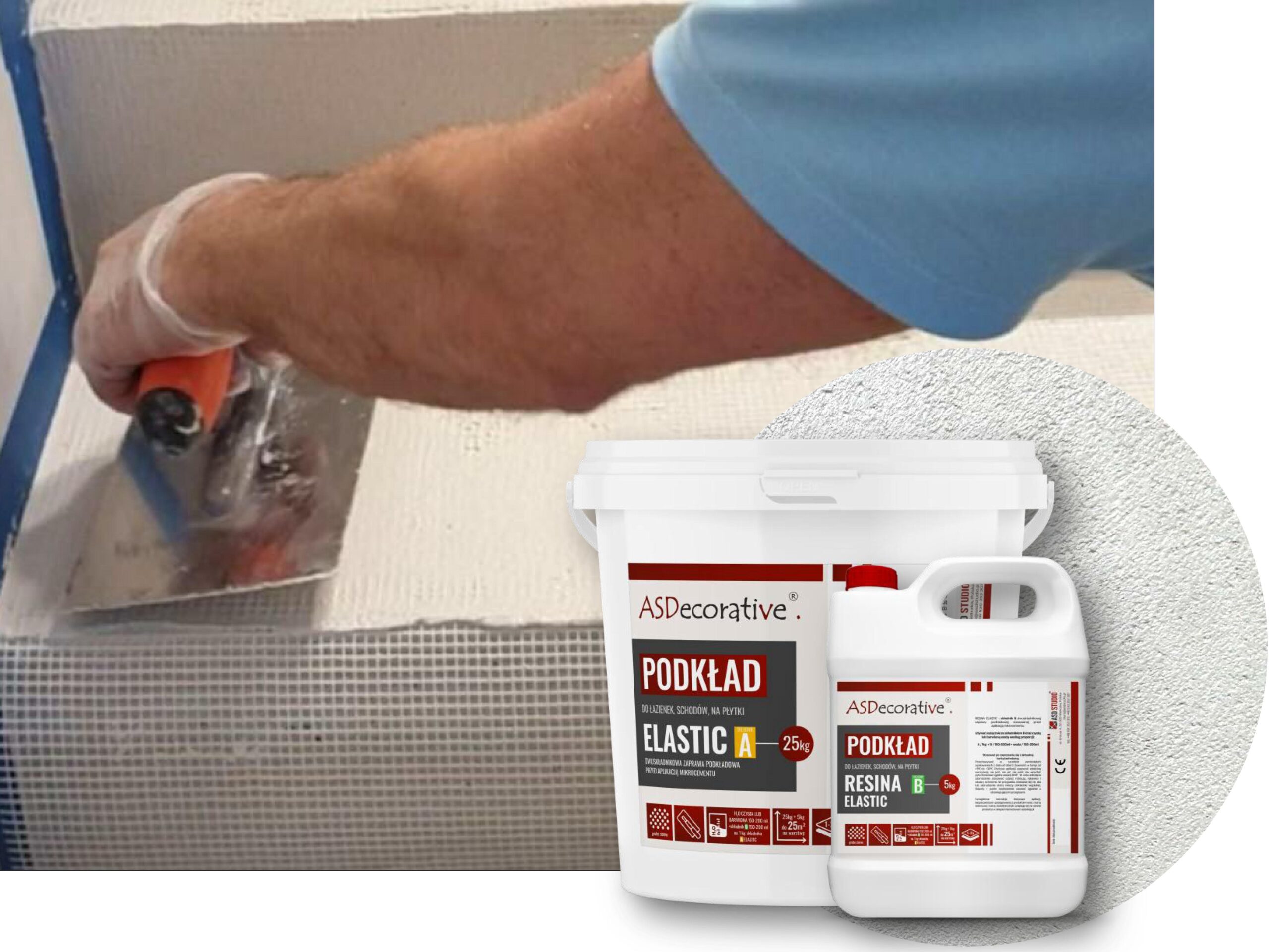 Płaską pacą tzw. blichówką, nakładamy możliwie najcieńszą warstwę, na grubość ziarna, na powierzchnię szerokości przygotowanego pasa siatki, następnie układamy siatkę i natychmiast nakładamy na nią drugą, również możliwie najcieńszą warstwę ELASTIC + RESINA.